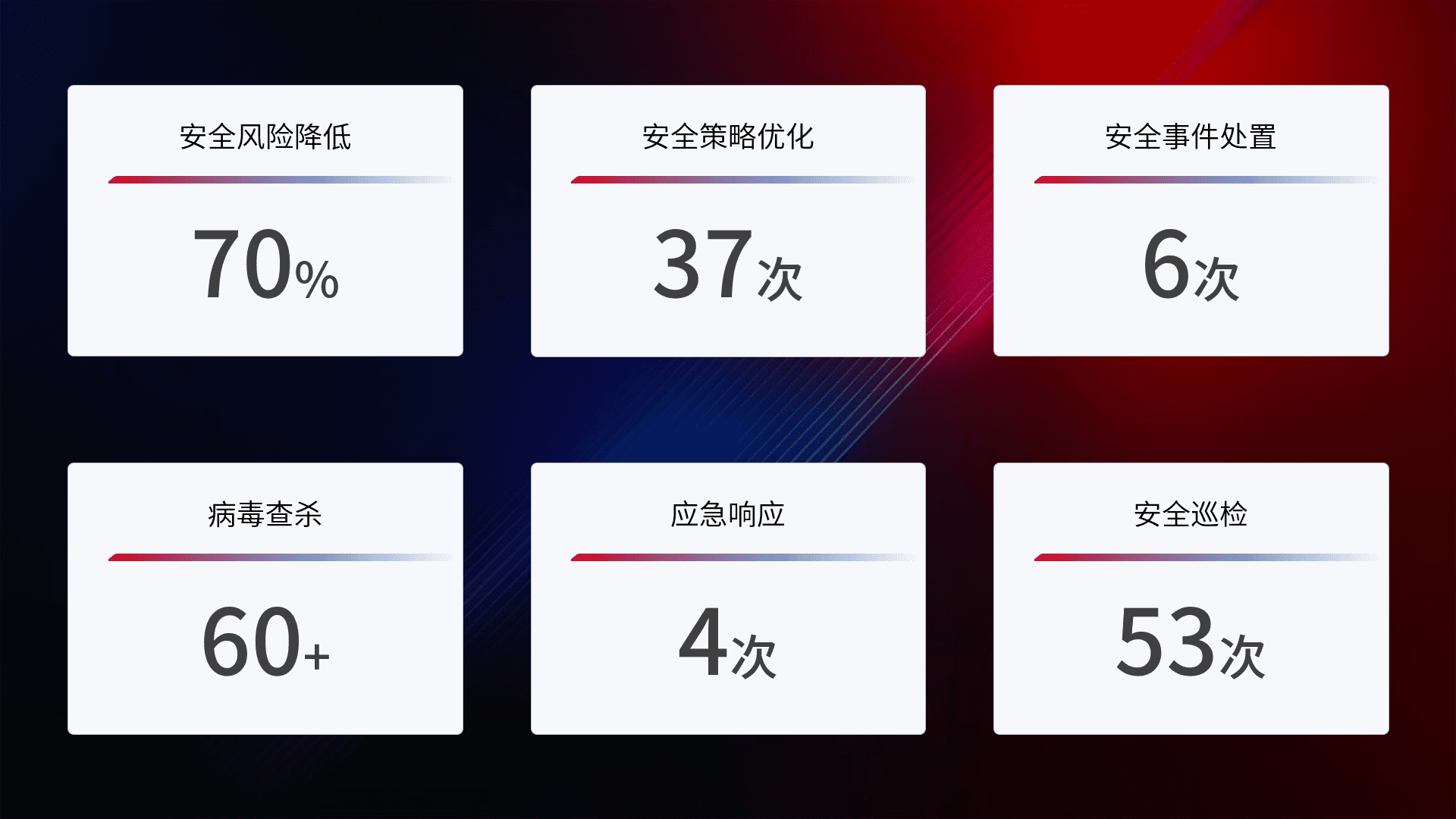 提供全面的安全事件报告体系,,,,包括处置报告、、、周报、、、季度和年度总结,,,结合持续监控,,帮助客户深入了解网络安全状况。。。。