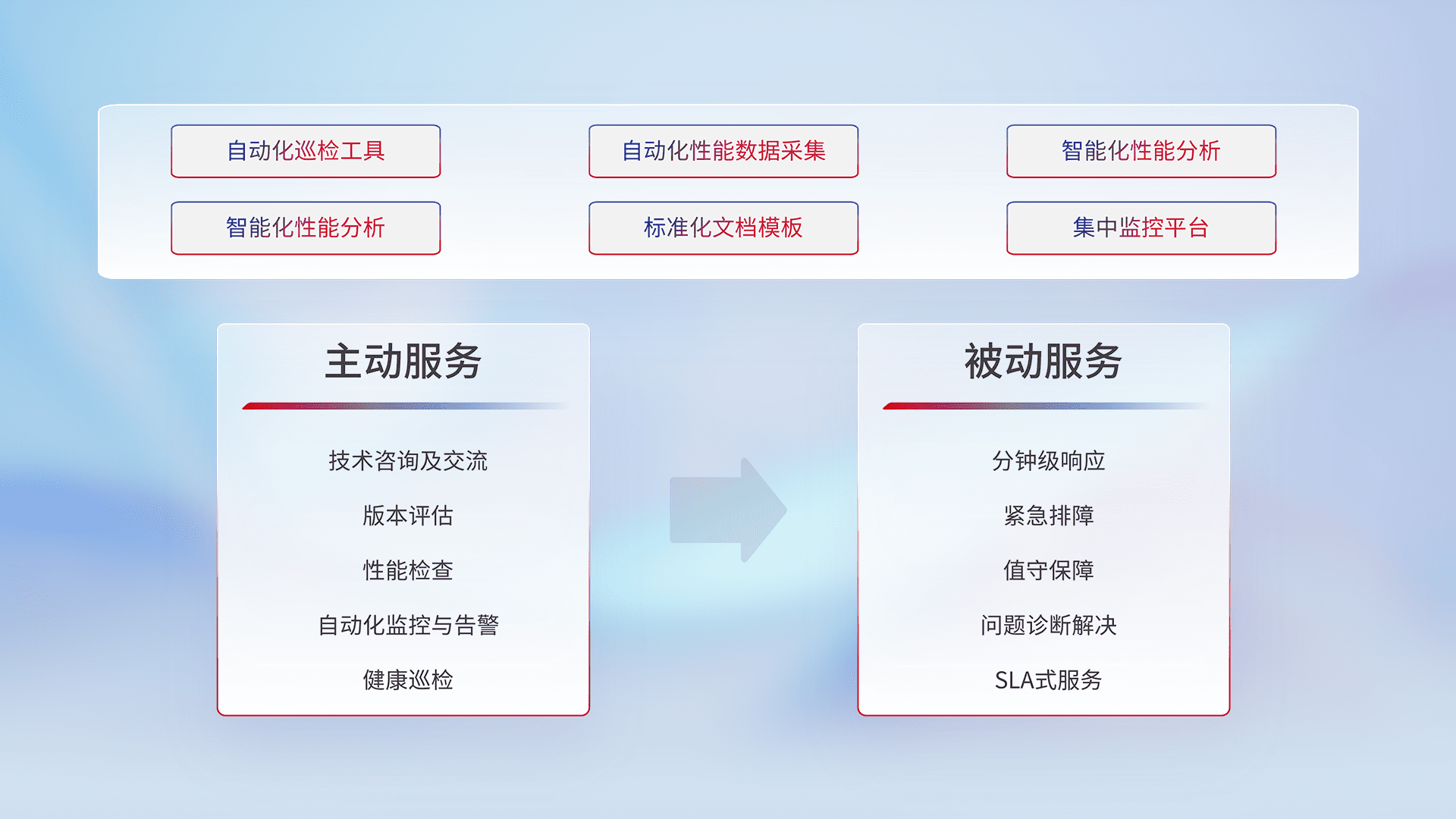 智能化工具和标准化文档,,,,保障服务质量,,,提供主动服务(包含技术咨询、、版本评估、、、、性能检查、、、自动化监控与告警、、、健康巡检)和被动服务包含(分钟级响应、、紧急排障、、、值守保障、、问题诊断解决、、SLA服务)。。。
